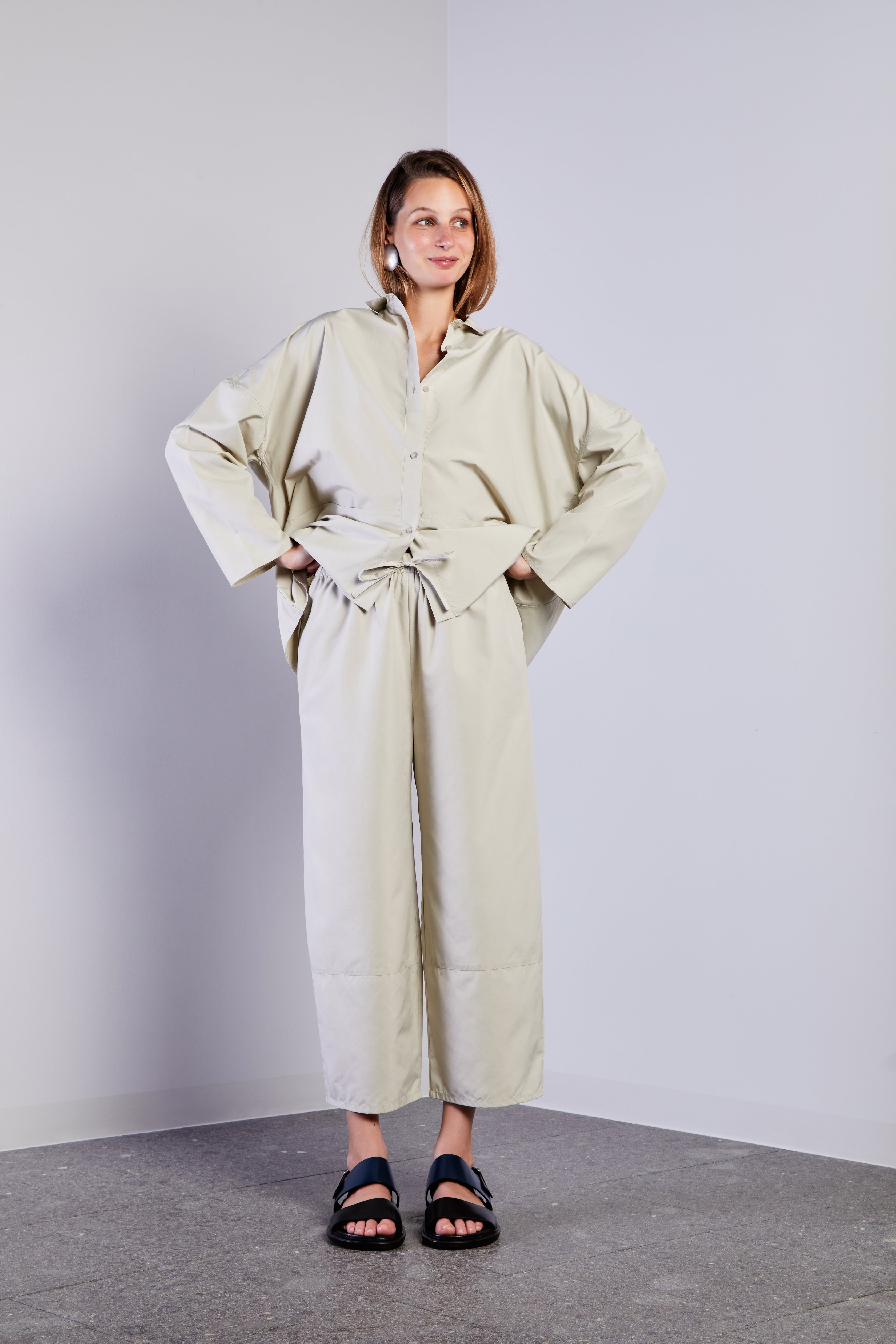 Camicia caratterizzata da spalle scese, ampie tasche applicate frontali e tasca posteriore oversize.