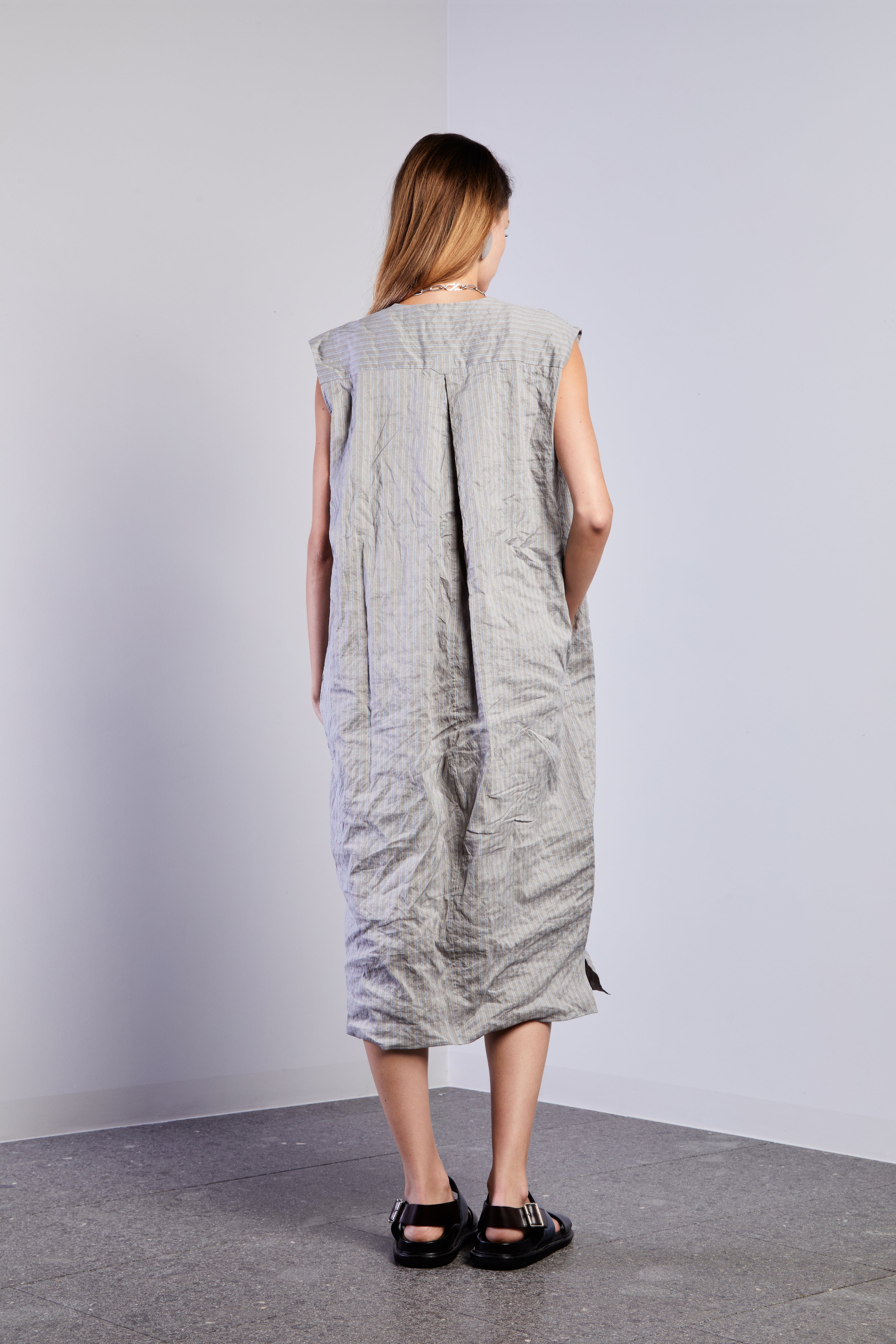 Abito lungo a gilet senza maniche, abbottonato, dal taglio dritto e spacchi laterali.