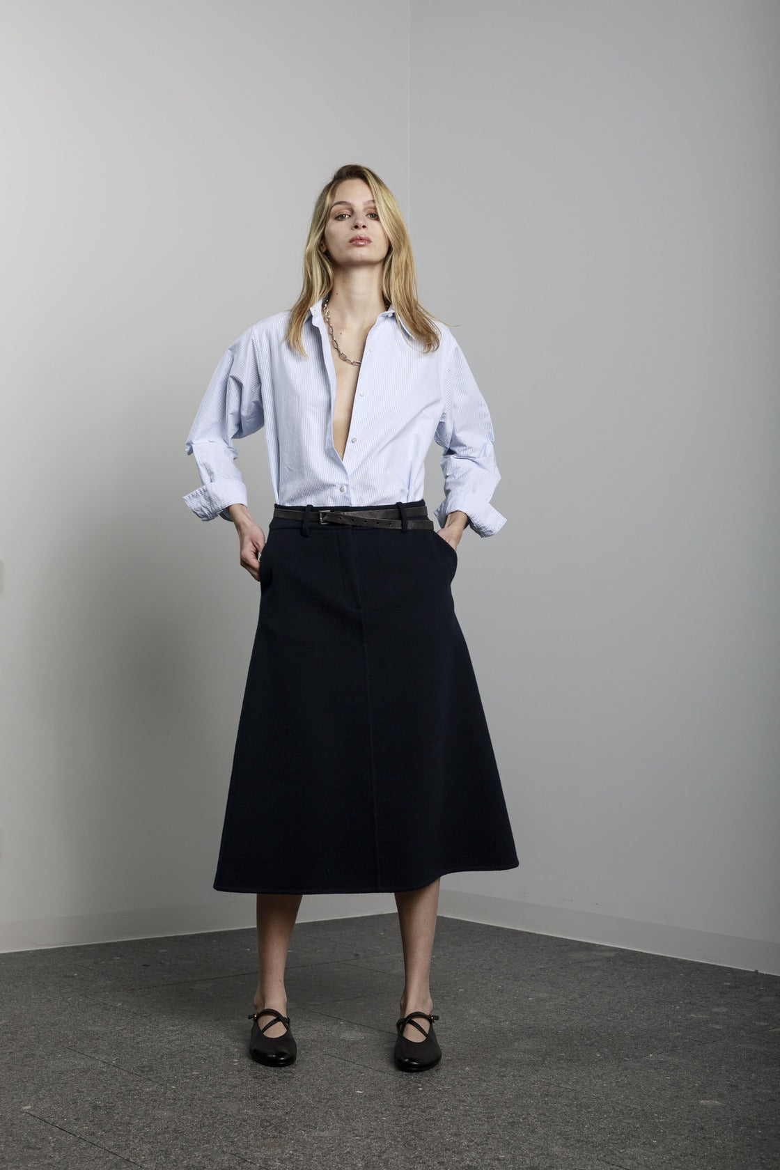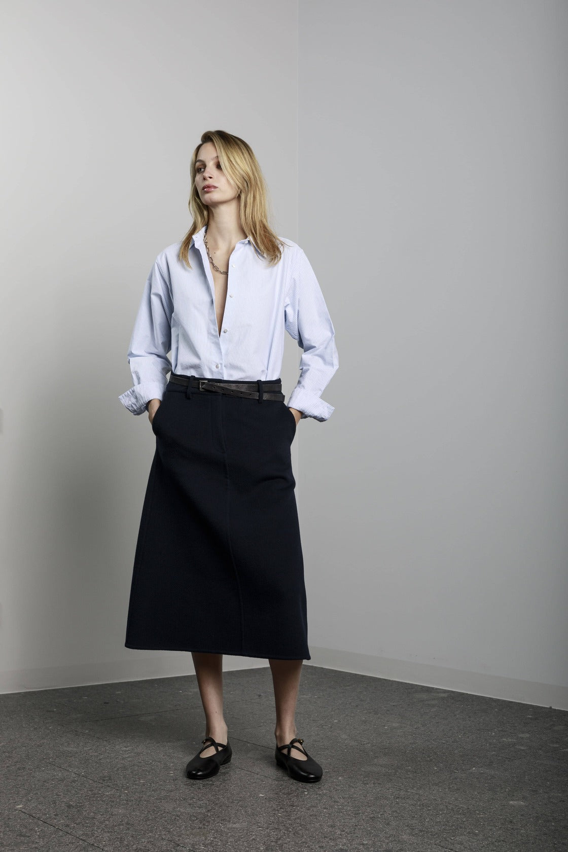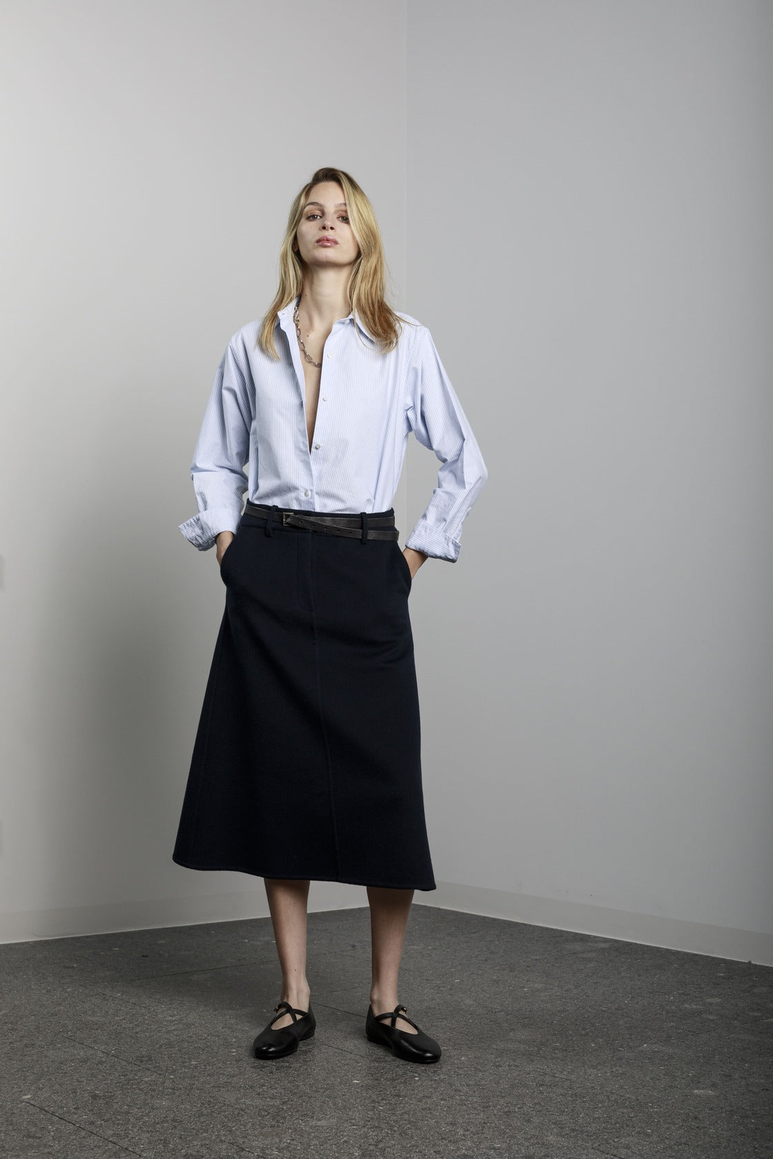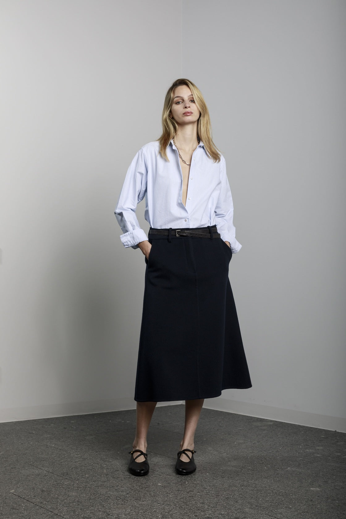 Visualizza prodotti similiGonna lunga a trapezio con tasche laterali, bottone e cerniera sul davanti.