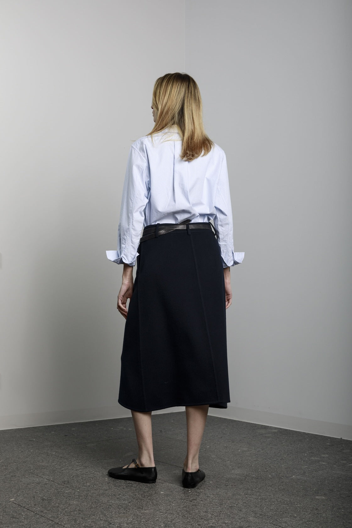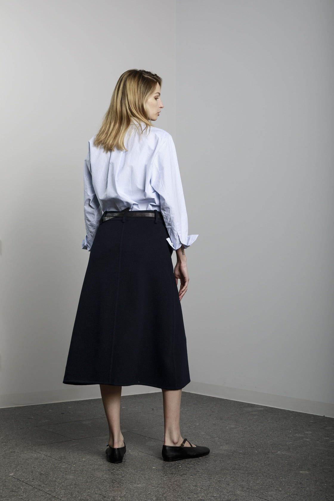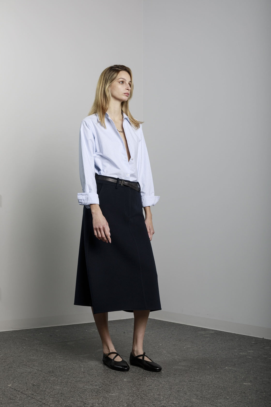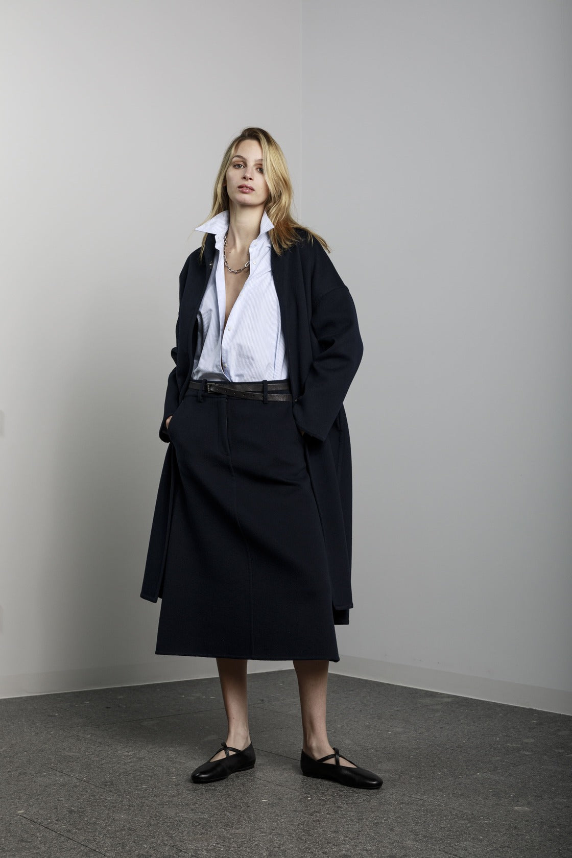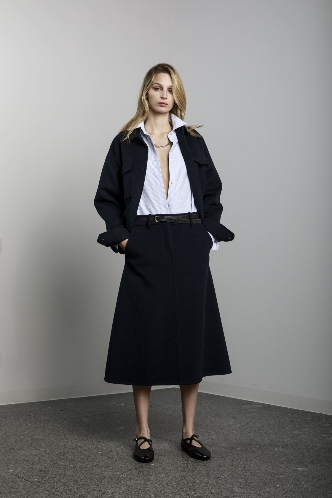 Visualizza prodotti similiGonna lunga a trapezio con tasche laterali, bottone e cerniera sul davanti.