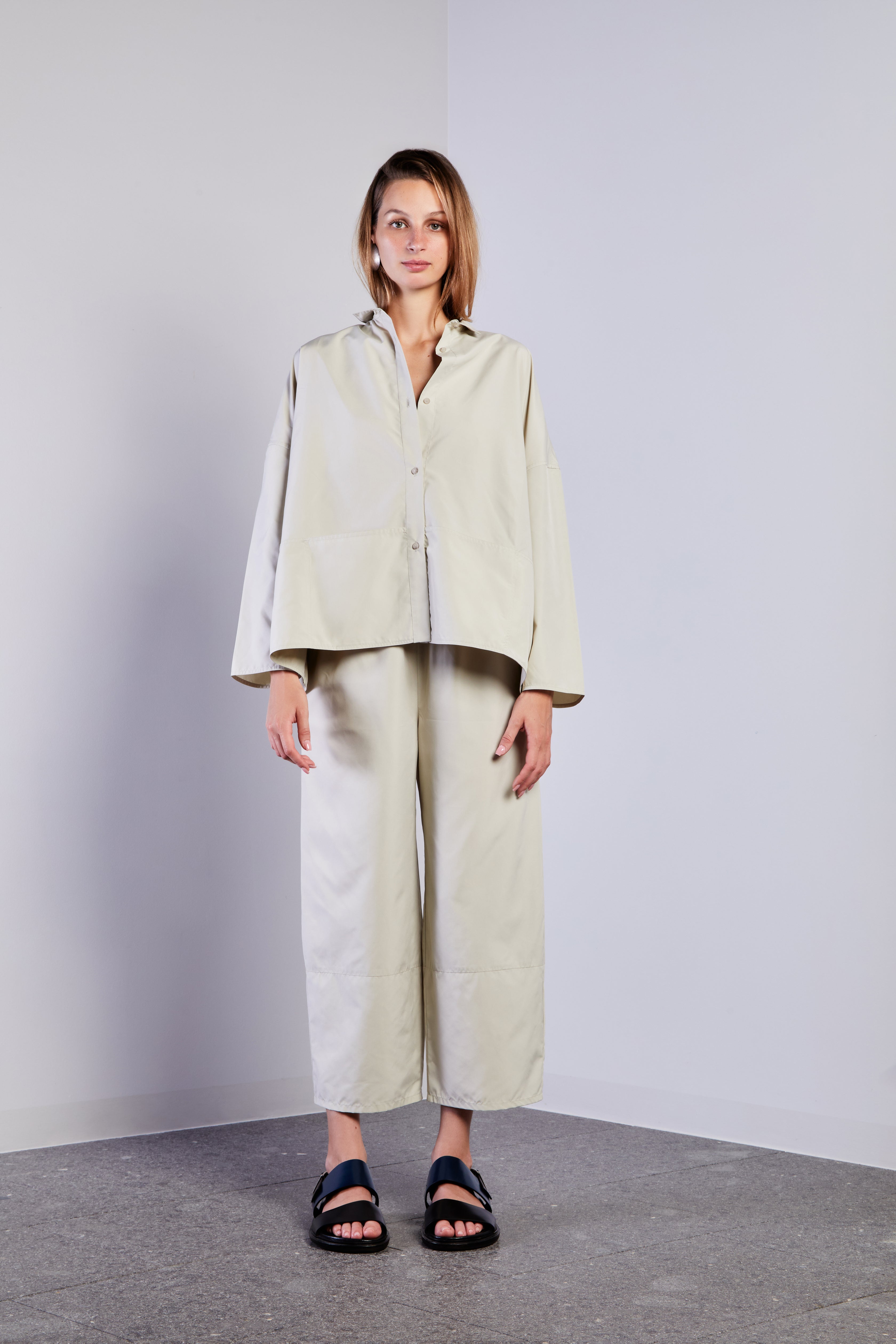 Pantaloni con vita elastica con coulisse, doppie tasche posteriori e gambe sottilmente affusolate creano una silhouette contemporanea.