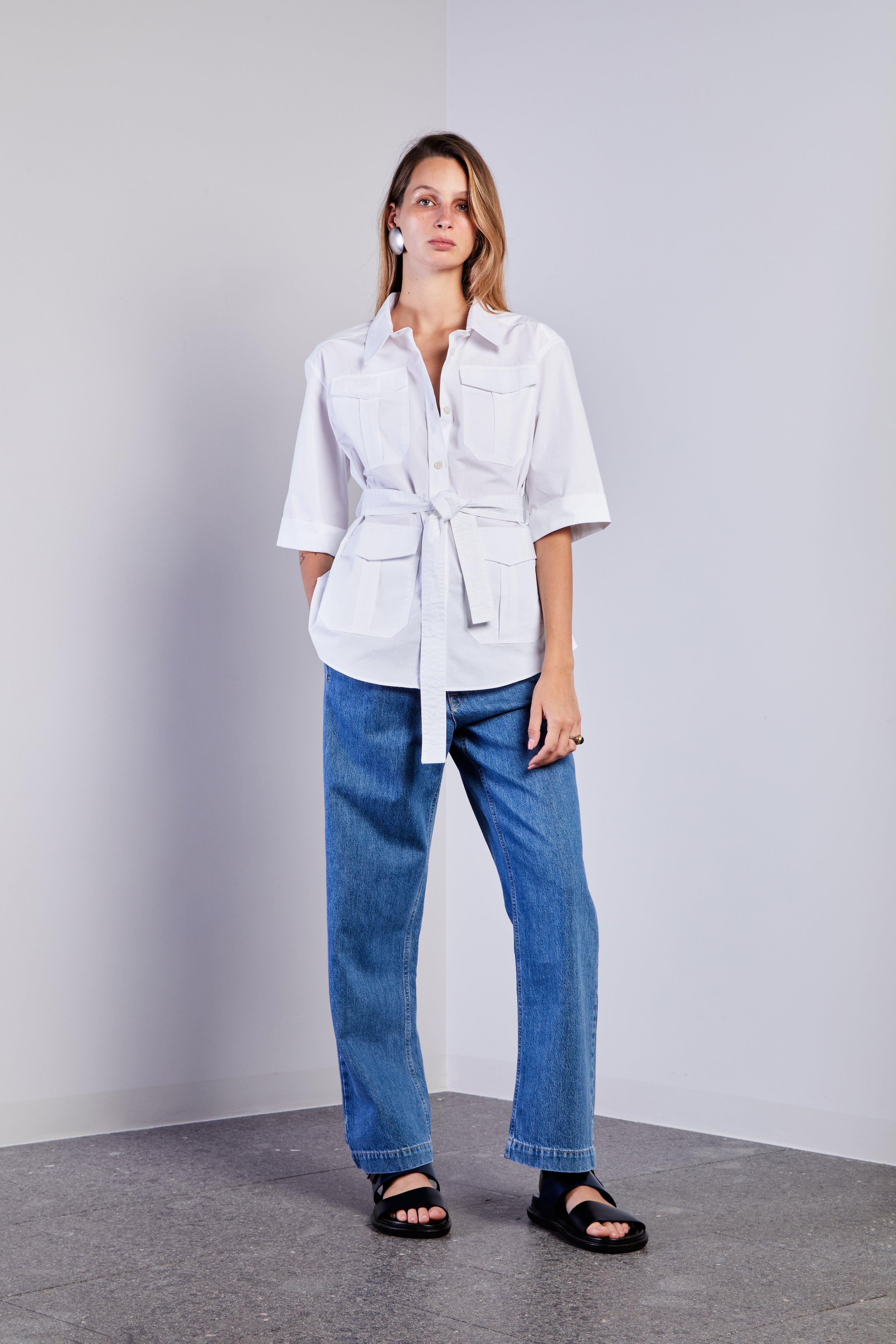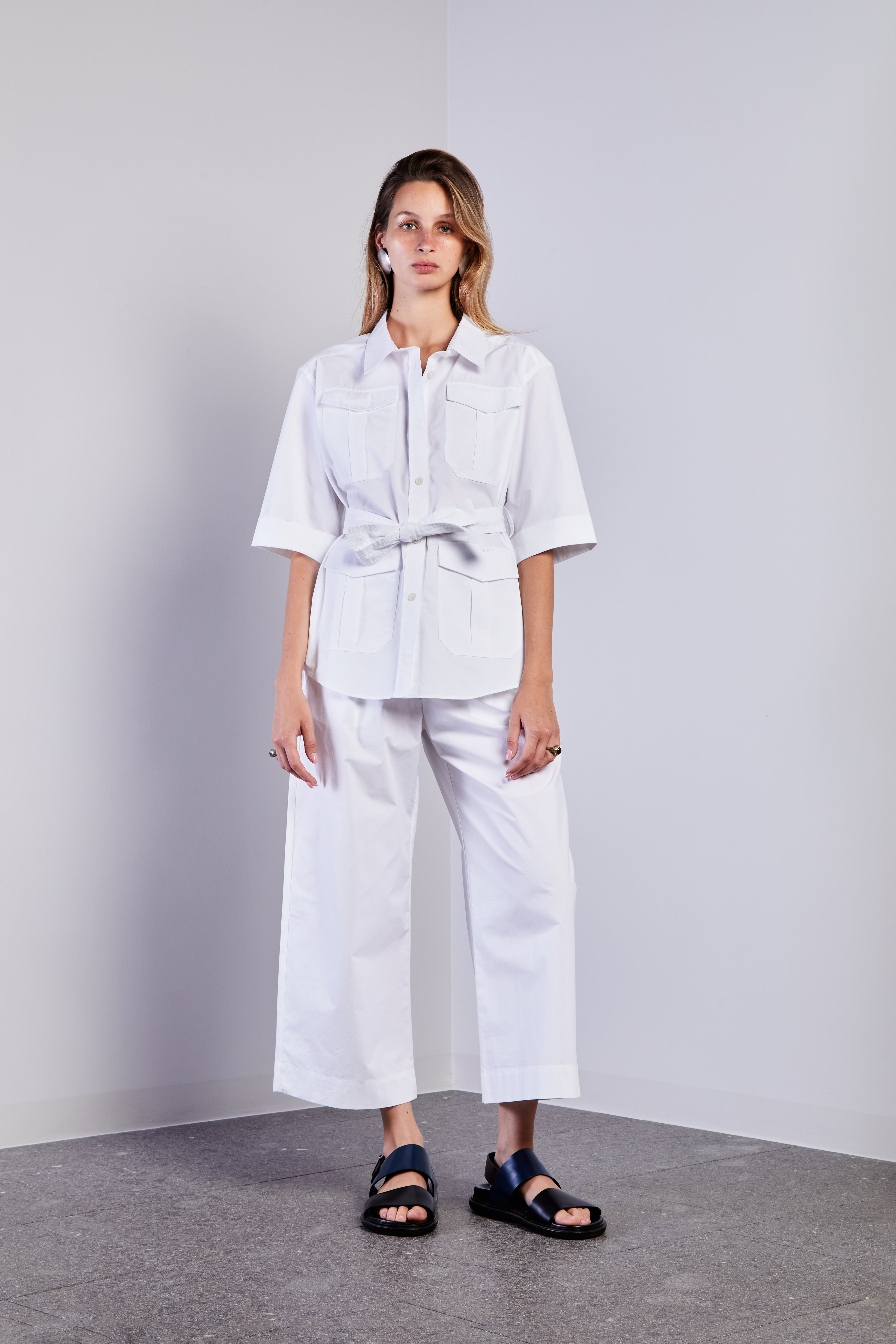 Modello safari con quattro tasche applicate munite di patta e classica cintura in vita.