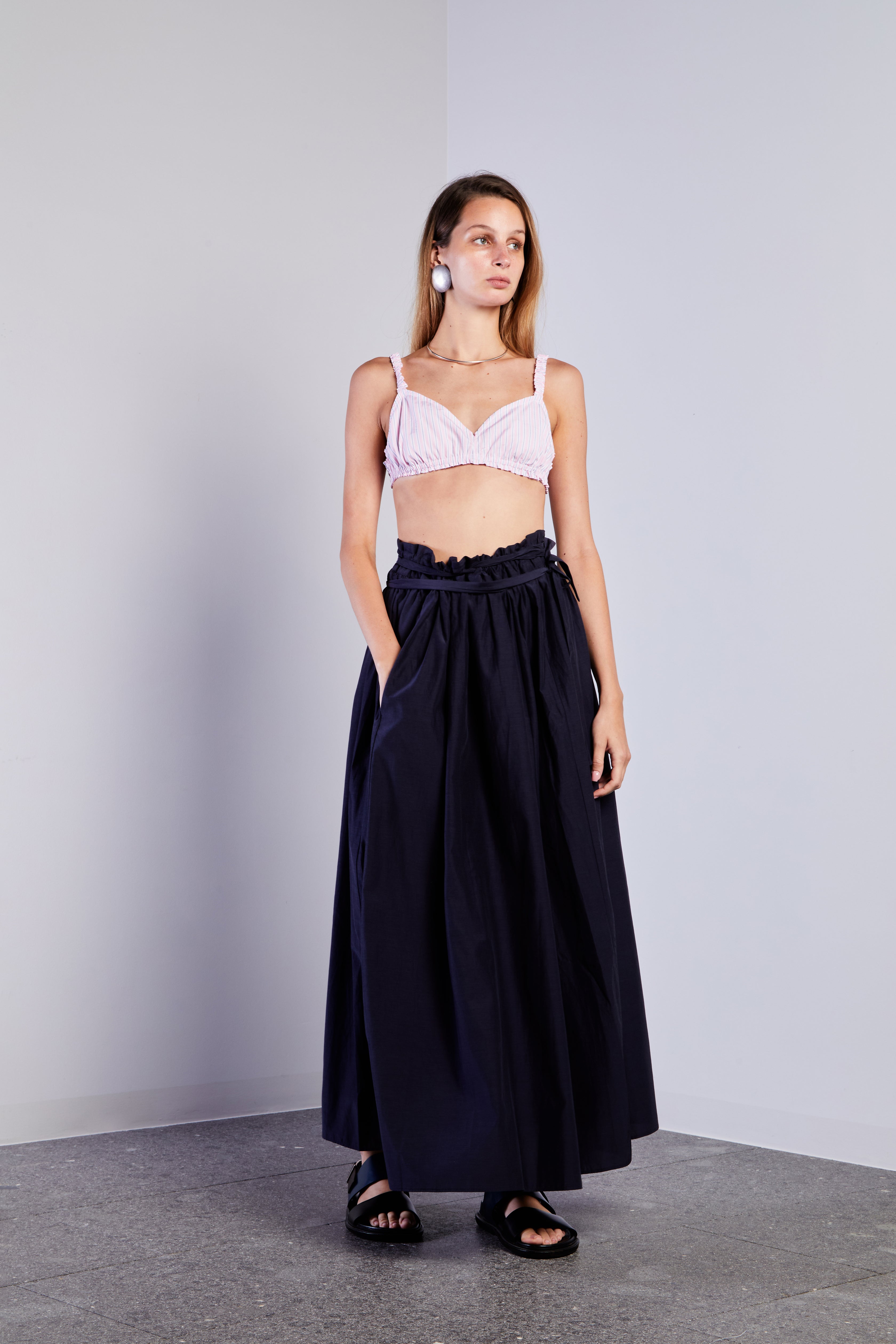Gonna alla caviglia con coulisse in vita, tasche laterali e volume arricciato che scende fluido fino all'orlo.