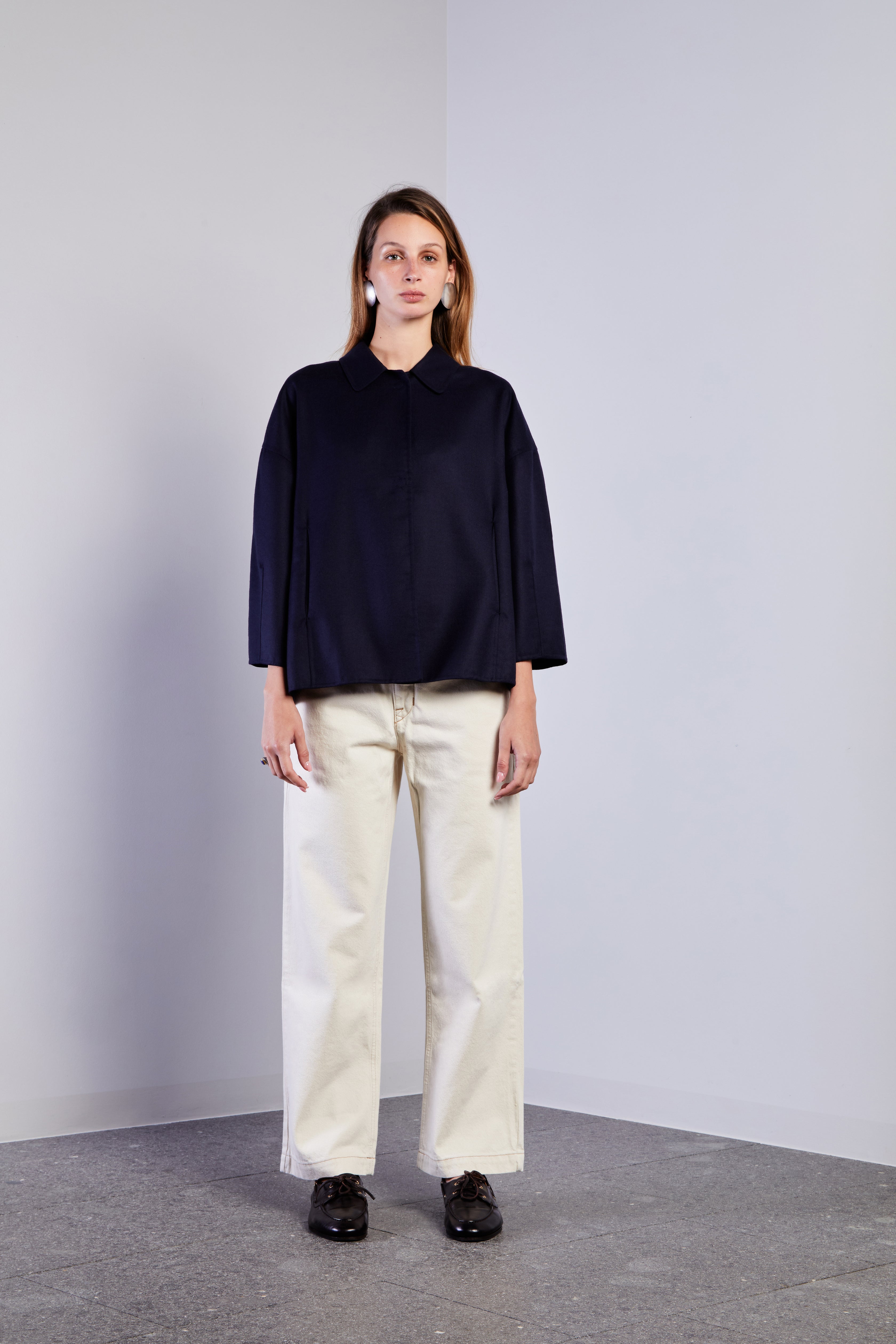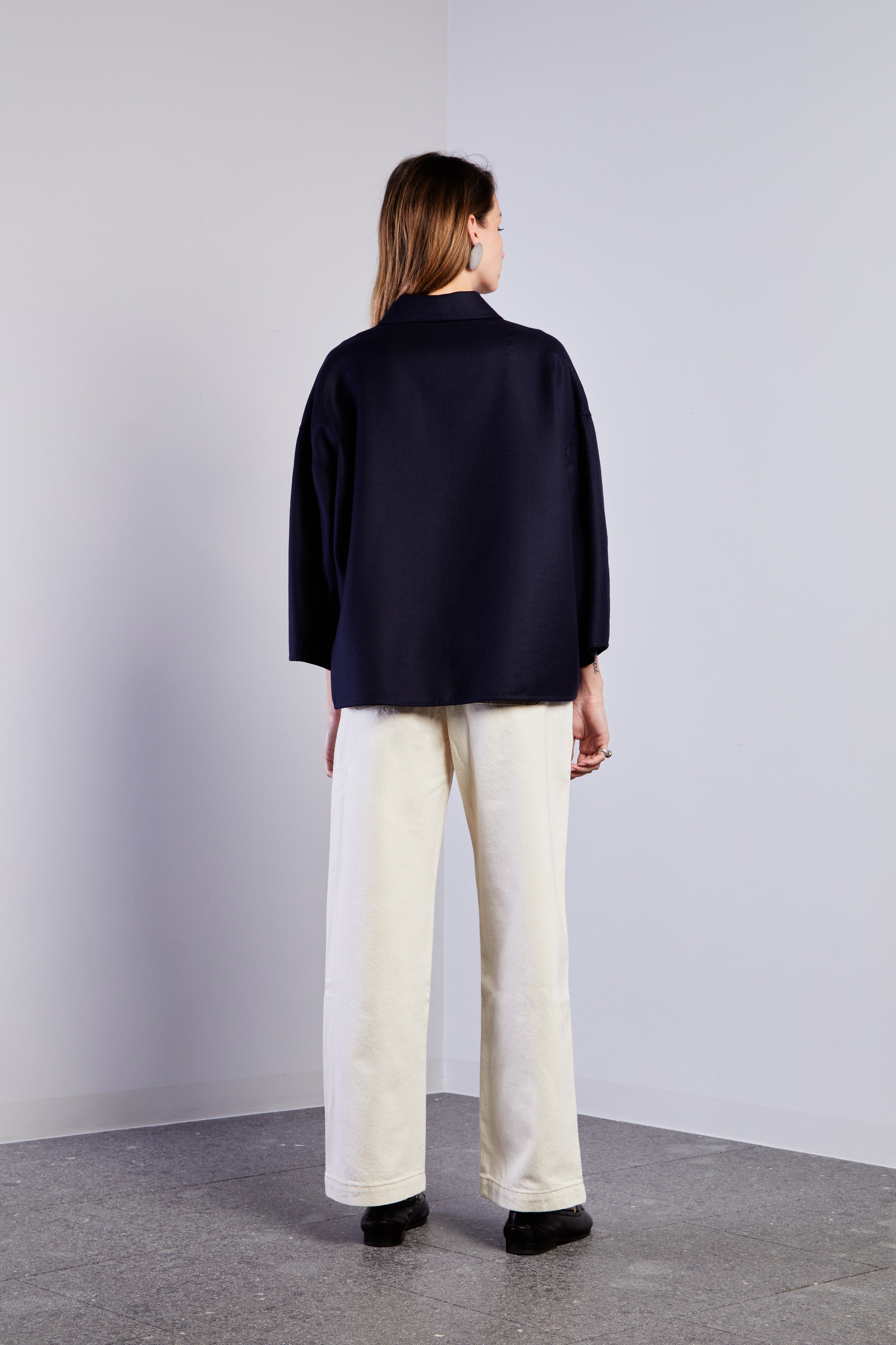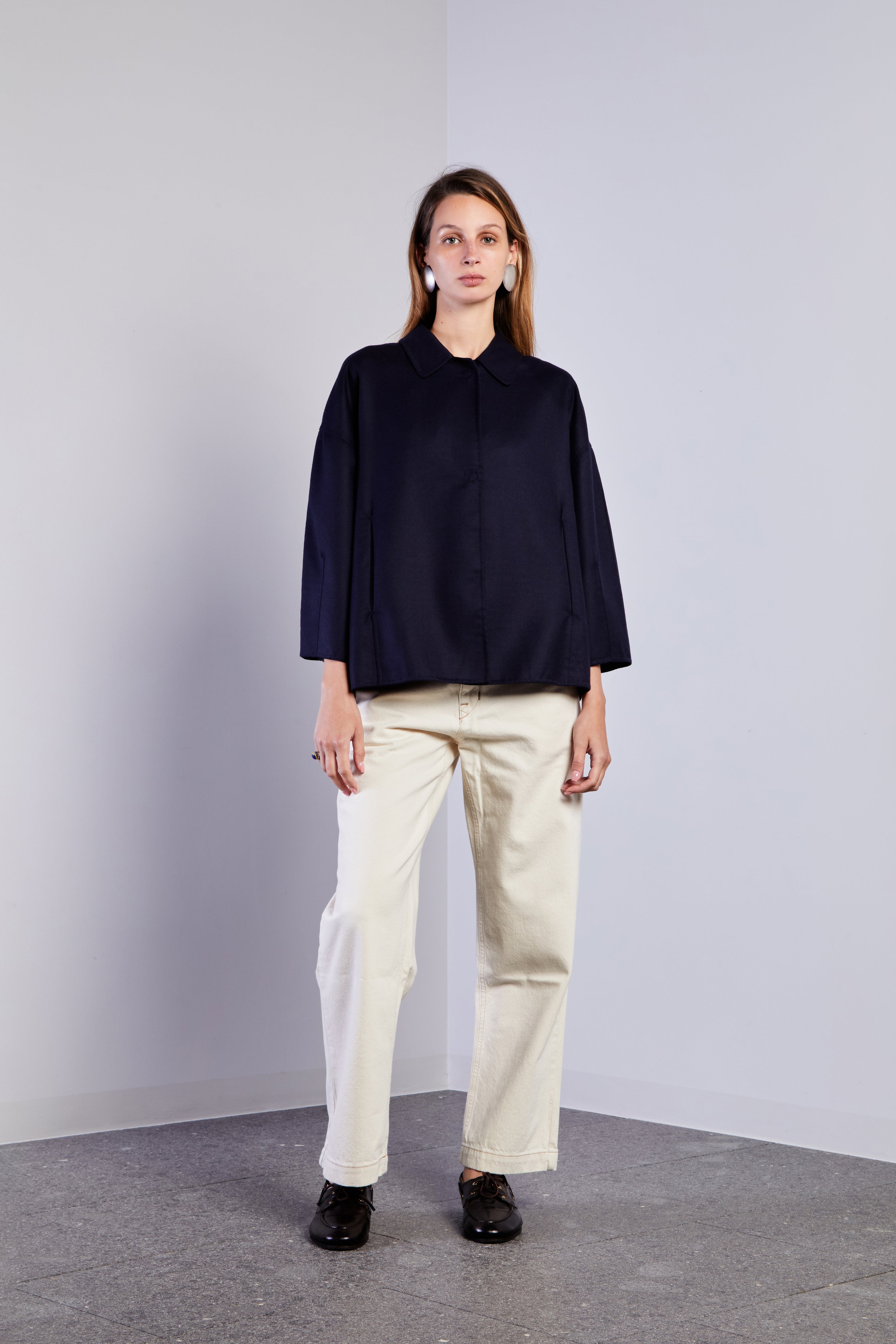 Giacca dalla silhouette strutturata ma rilassata con spalle scese, maniche affusolate sopra il polso. Chiusa sul davanti tramite bottoni automatici.