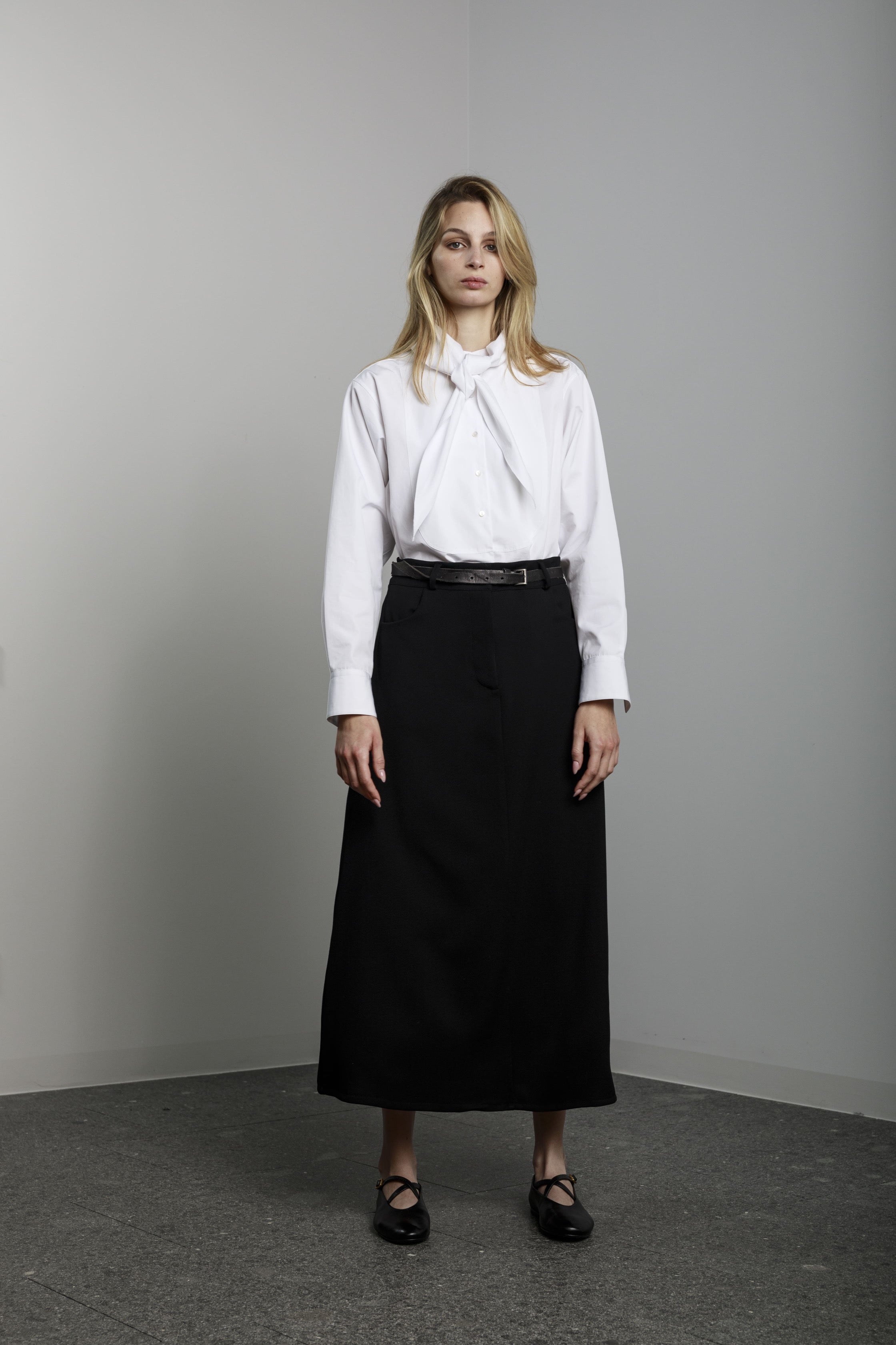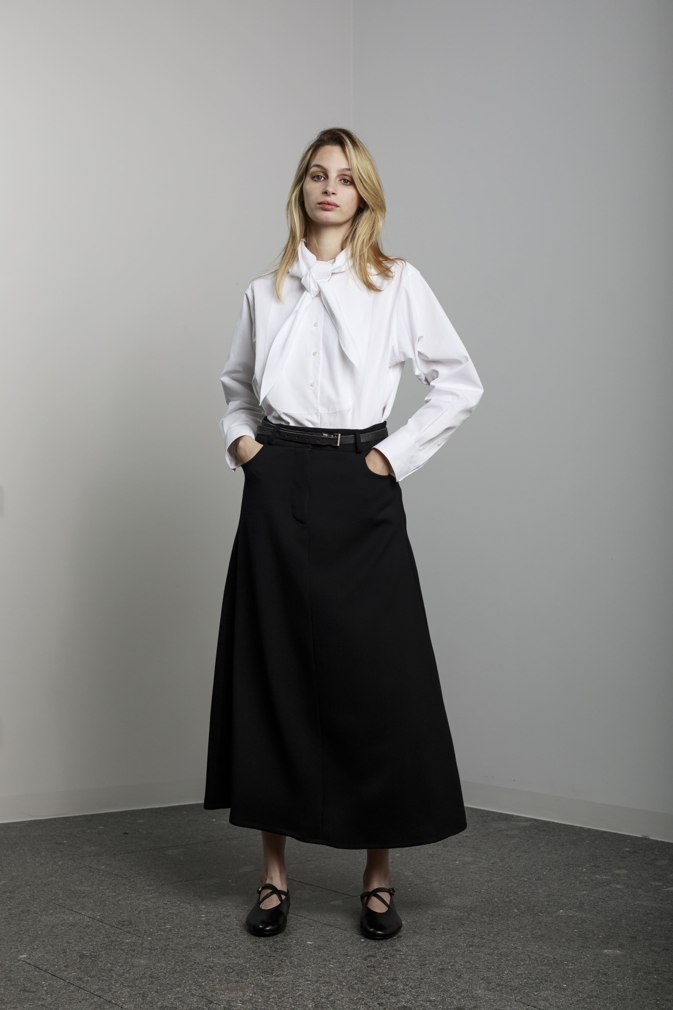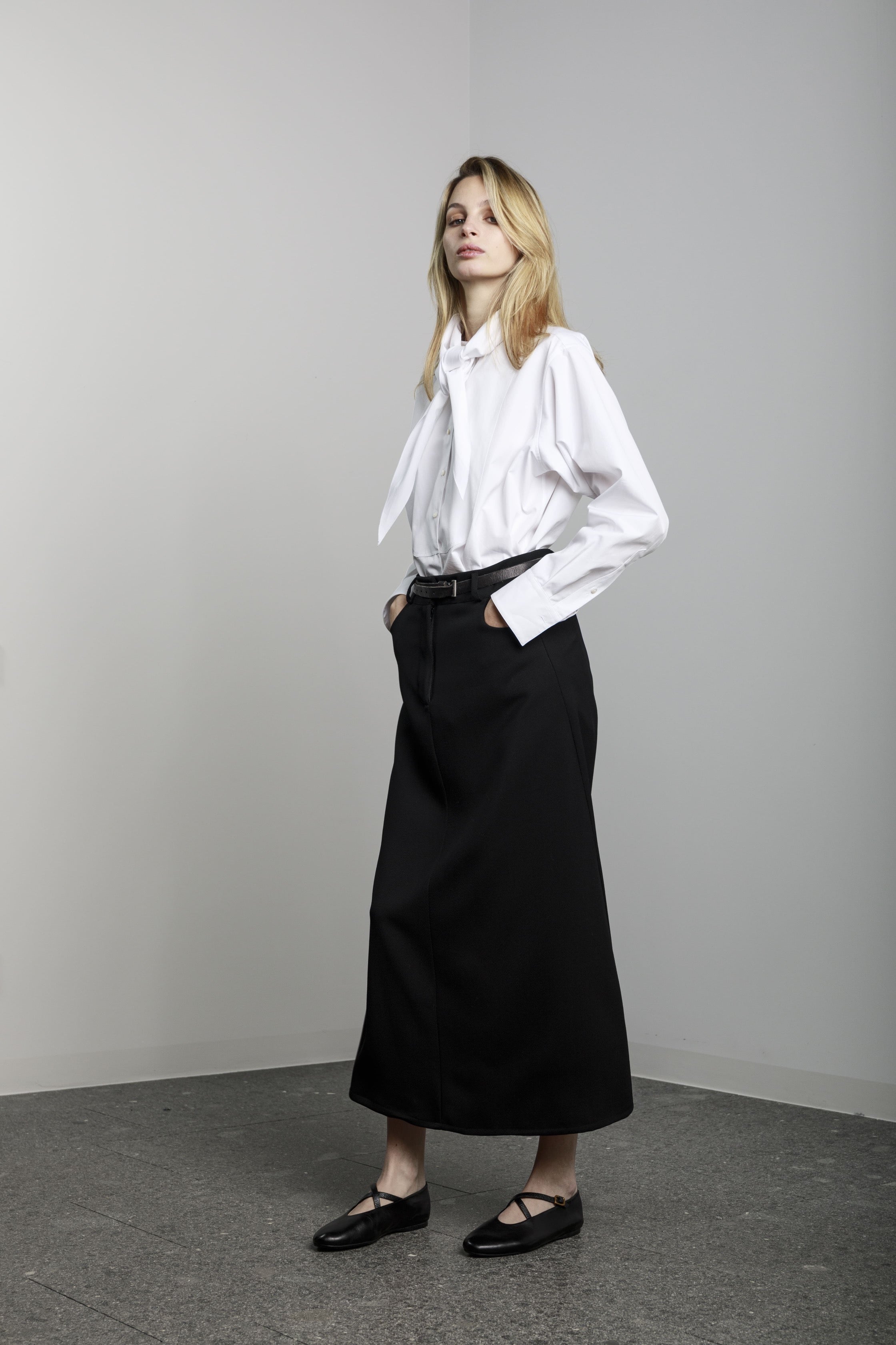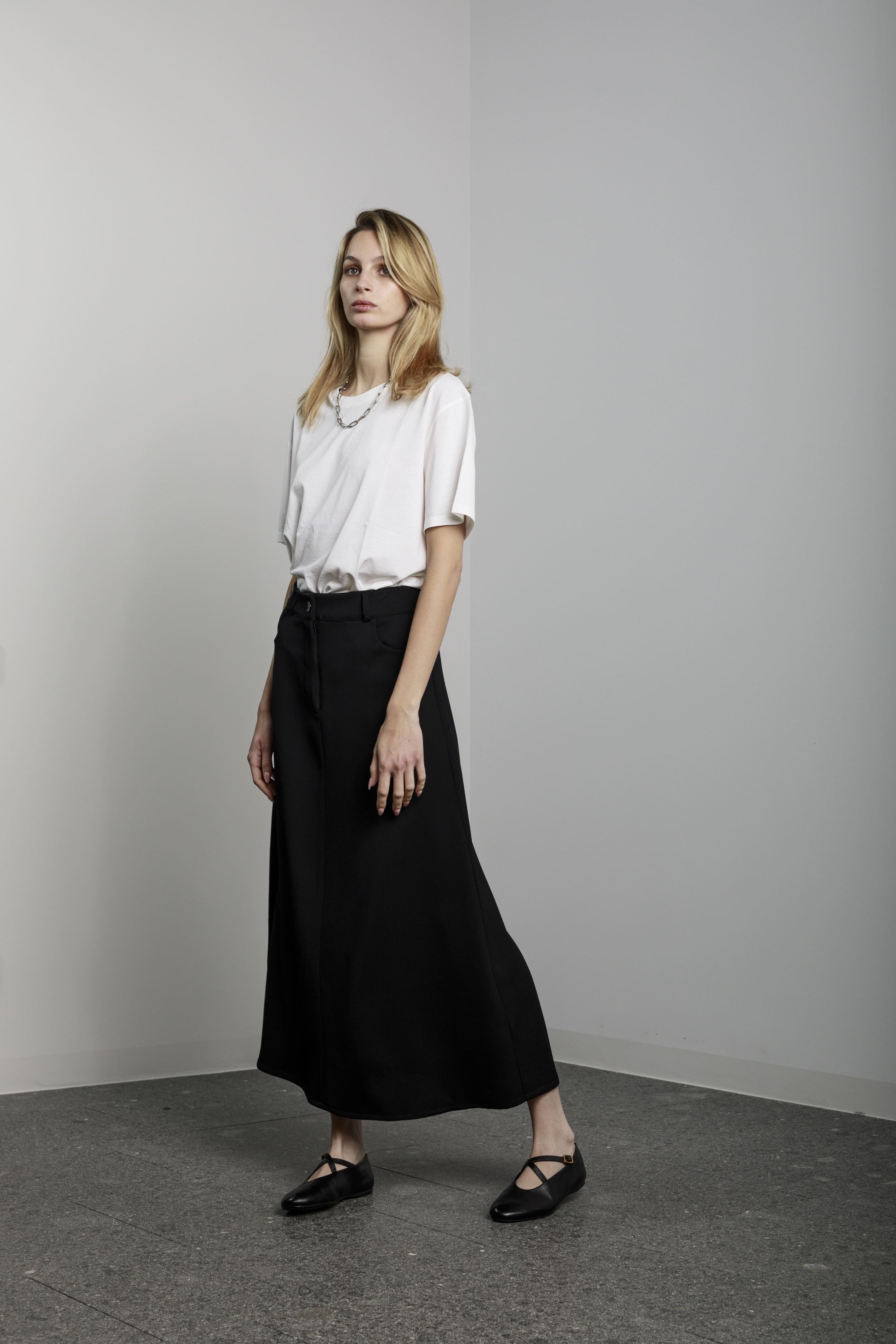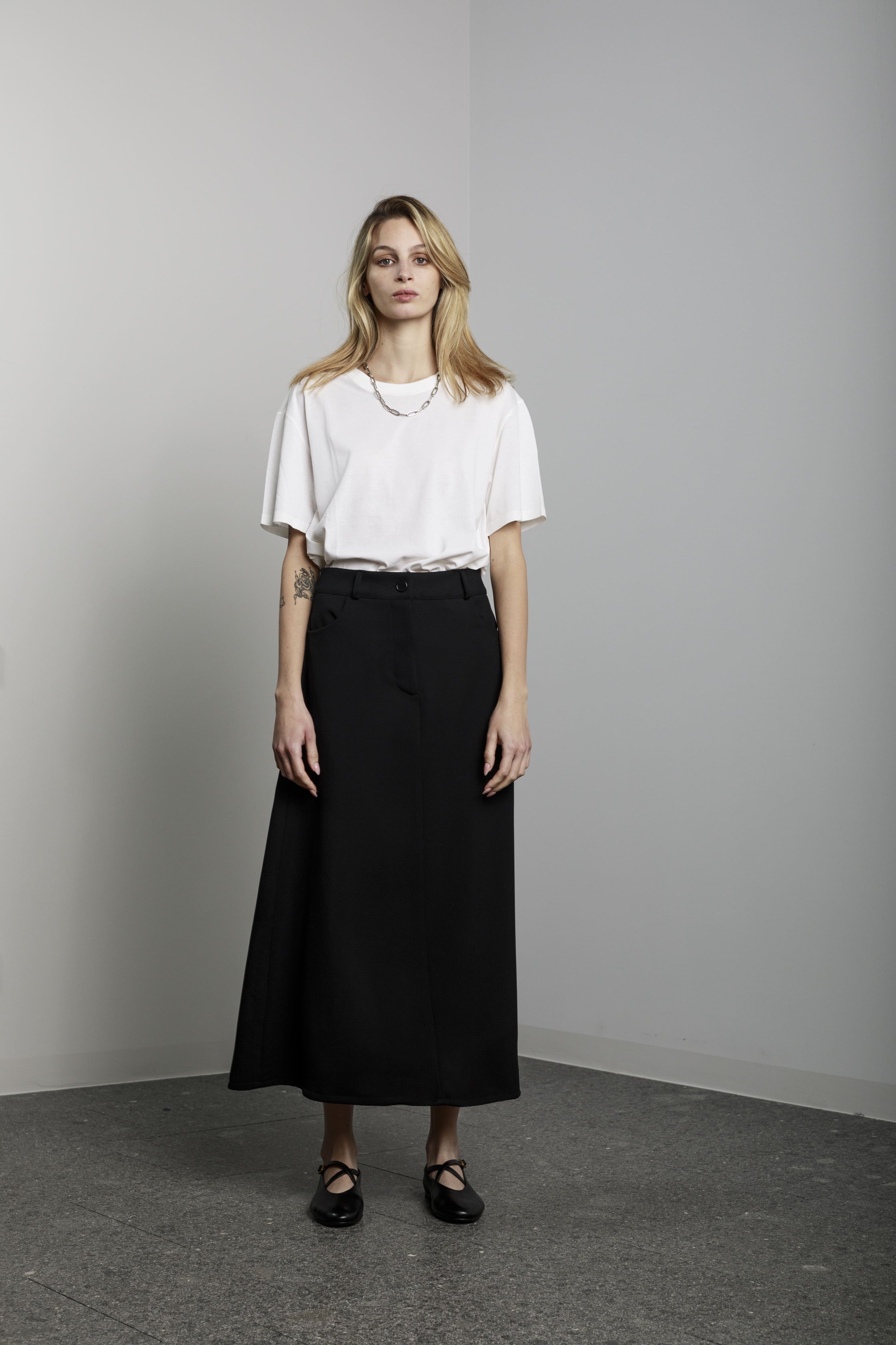 View Similar ProductsLong a-shaped skirt with side pockets and front button and zip.
