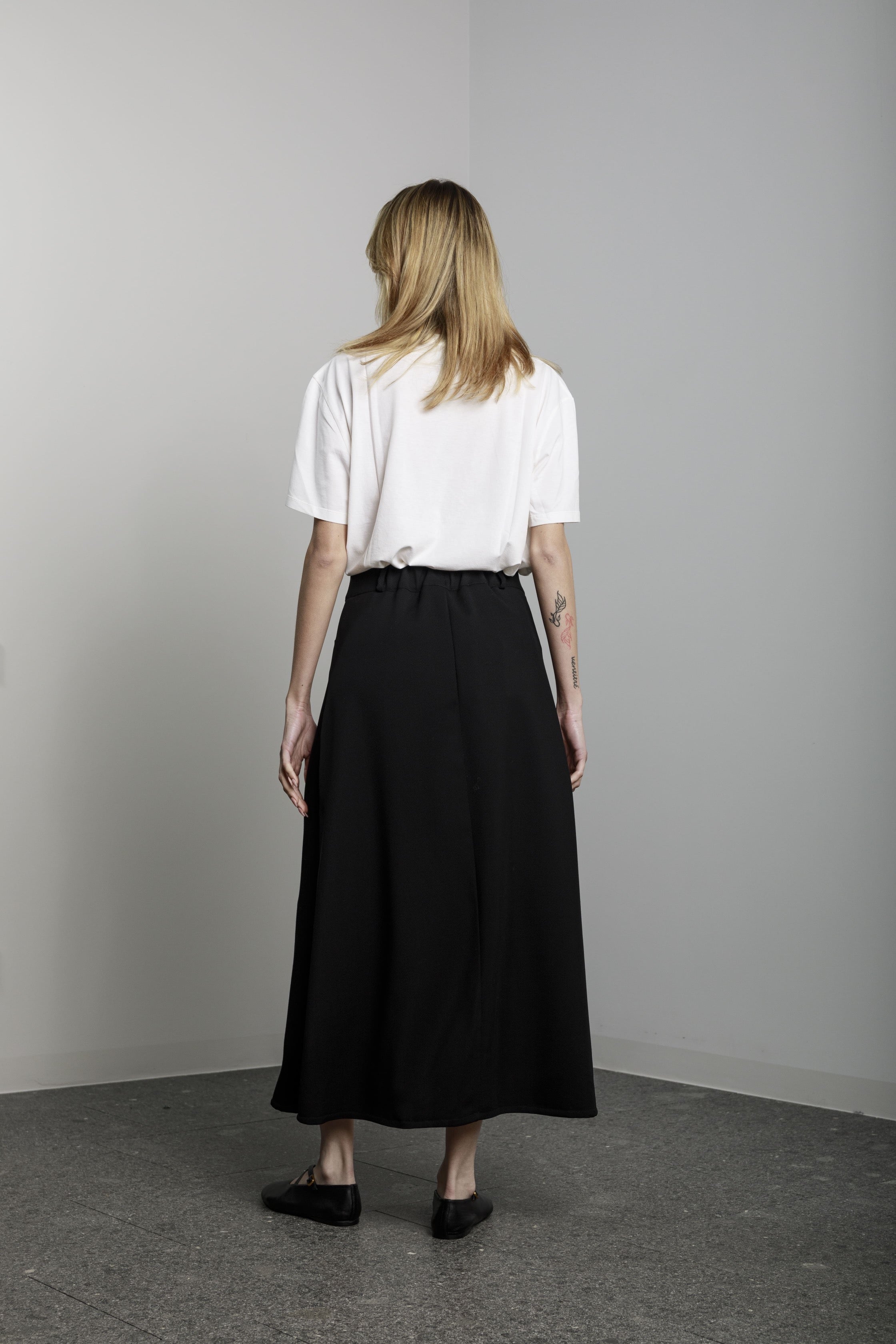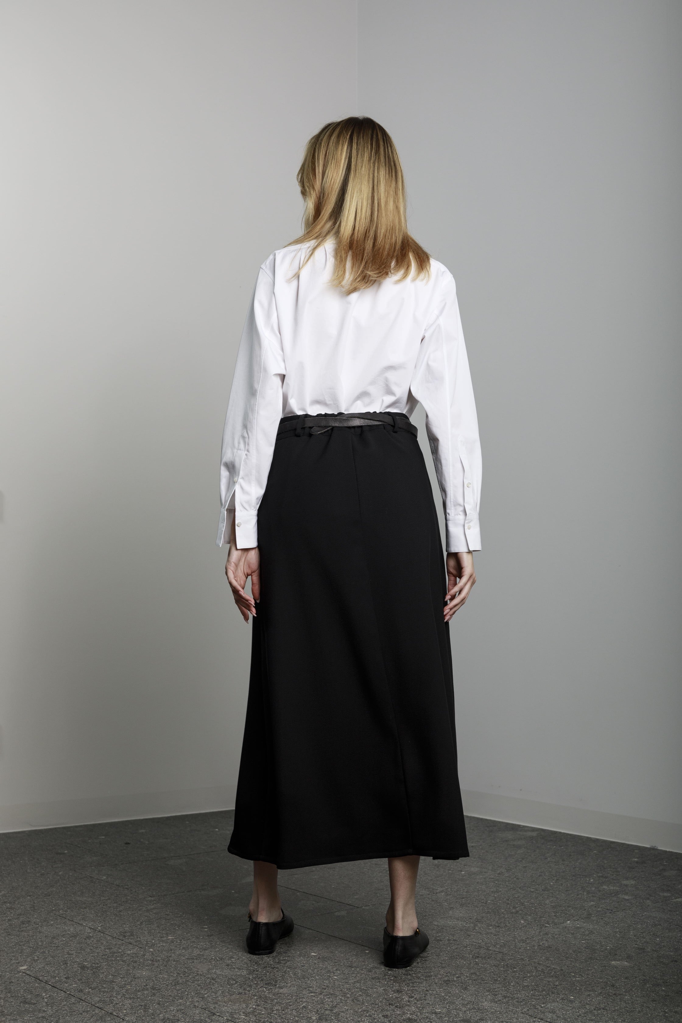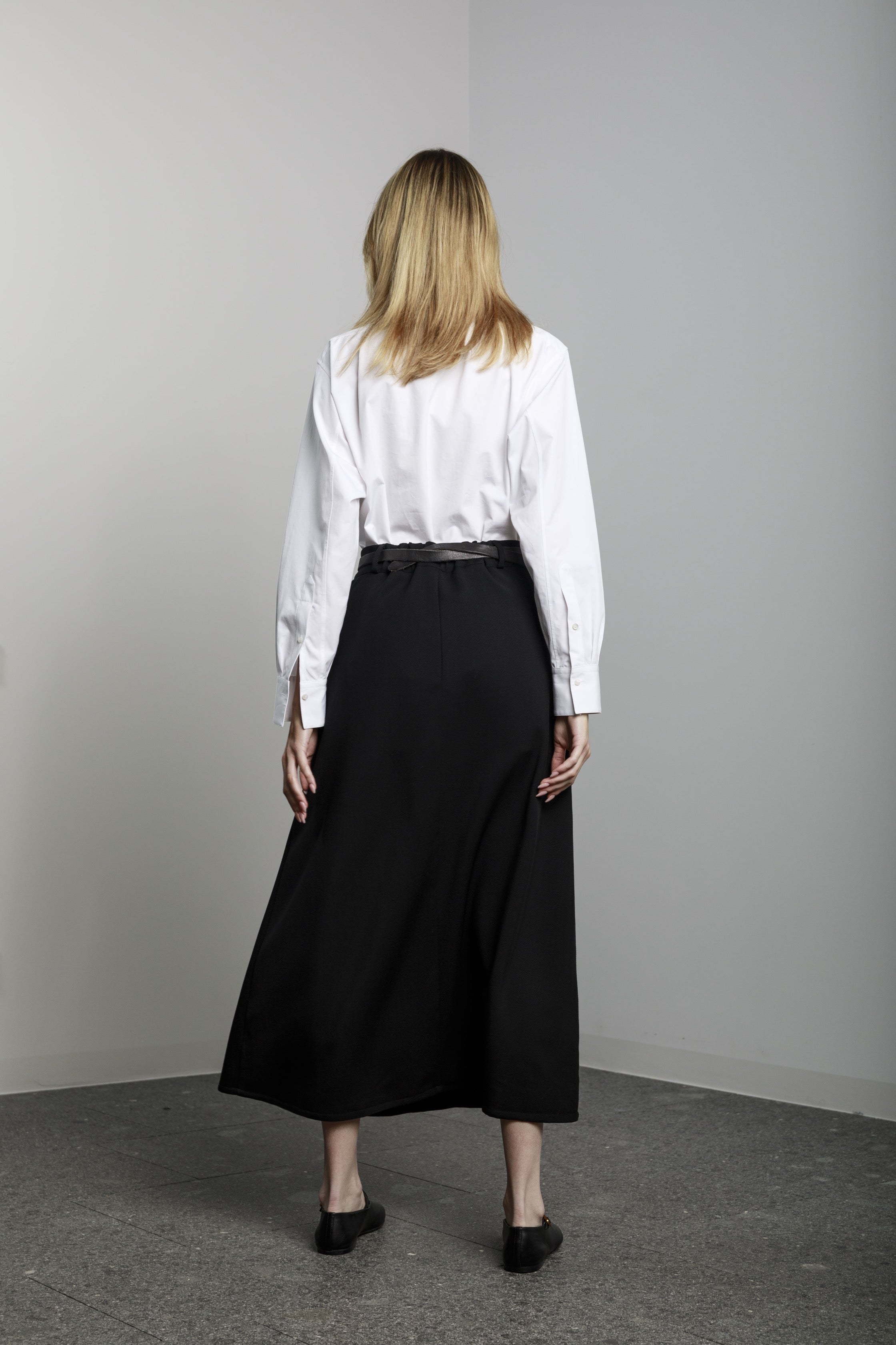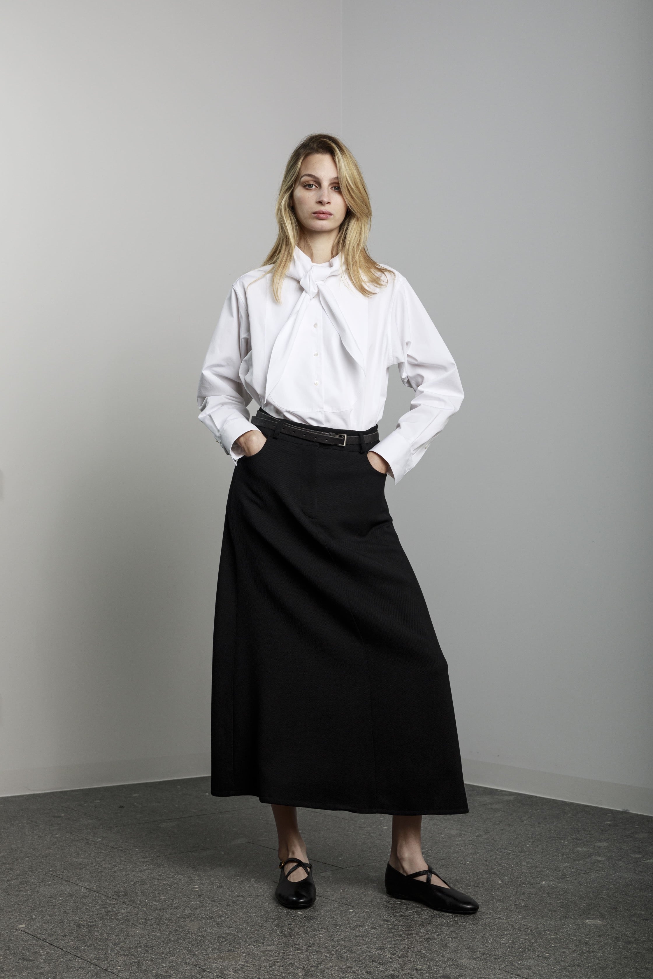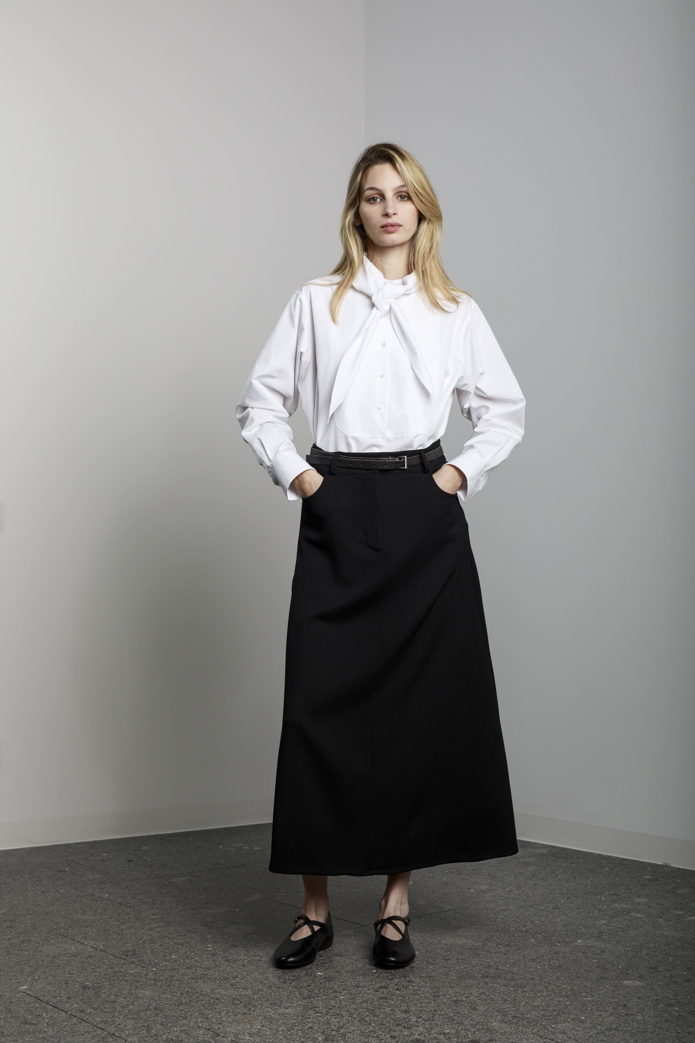 View Similar ProductsLong a-shaped skirt with side pockets and front button and zip.