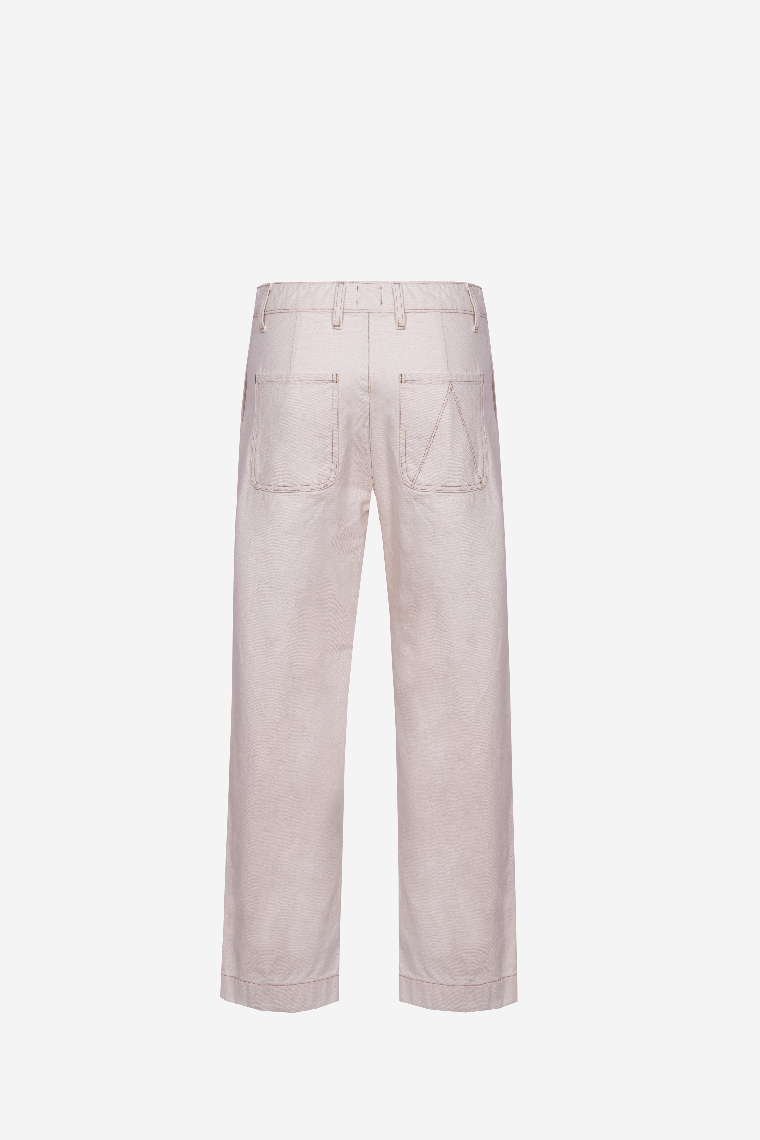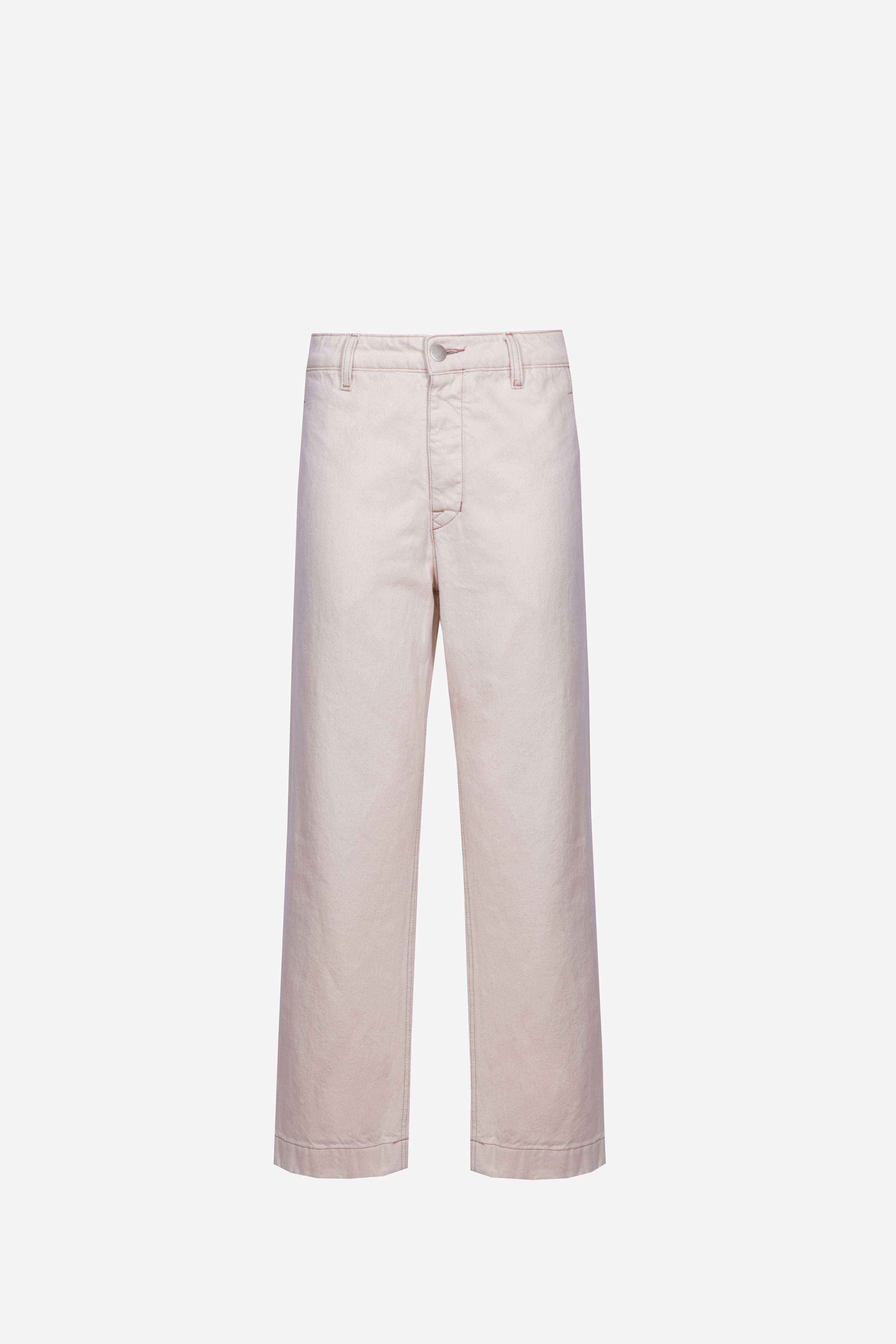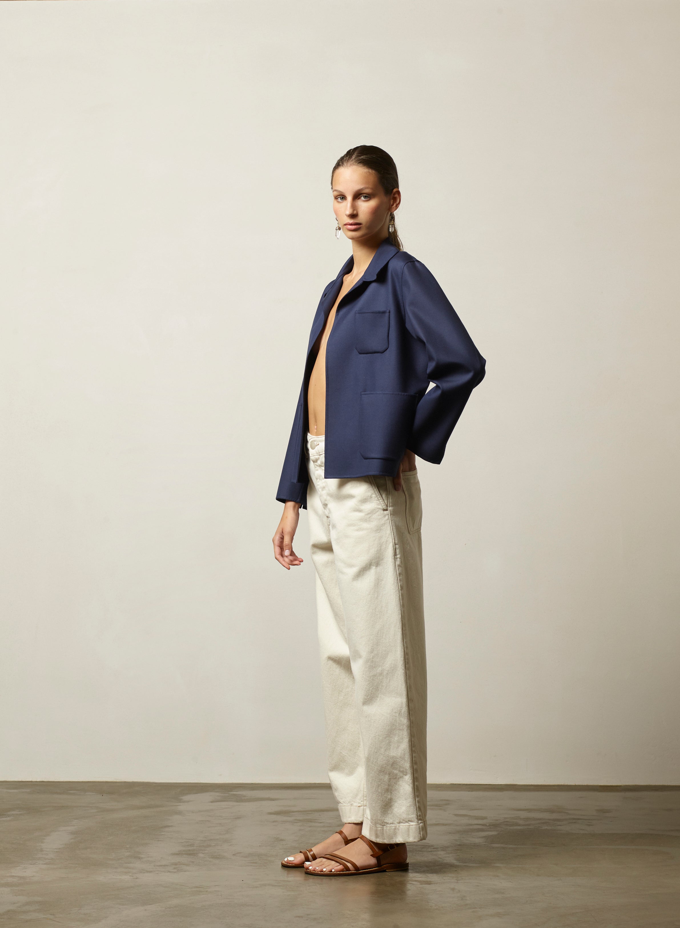 An organic certificated Italian 12 ounce denim subject to a special salt-washing, free from chemicals.